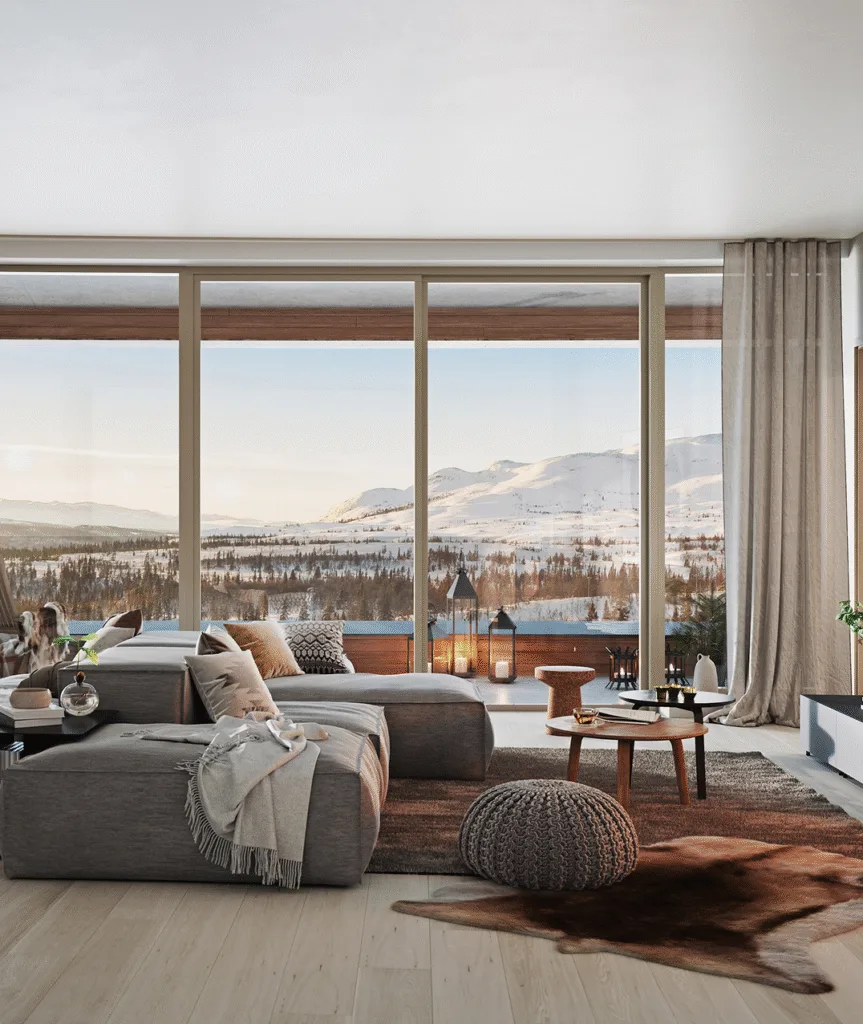 Ullådalsstugan rymmer 66 lägenheter från cirka 45 till 115 kvm, från det mindre fjällboendet till större lägenheter för familj och vänner. Arkitekturen och interiören är modern alpin, med generösa fönsterpartier, exklusiva materialval och planlösningar som öppnar varje rum mot landskapet.